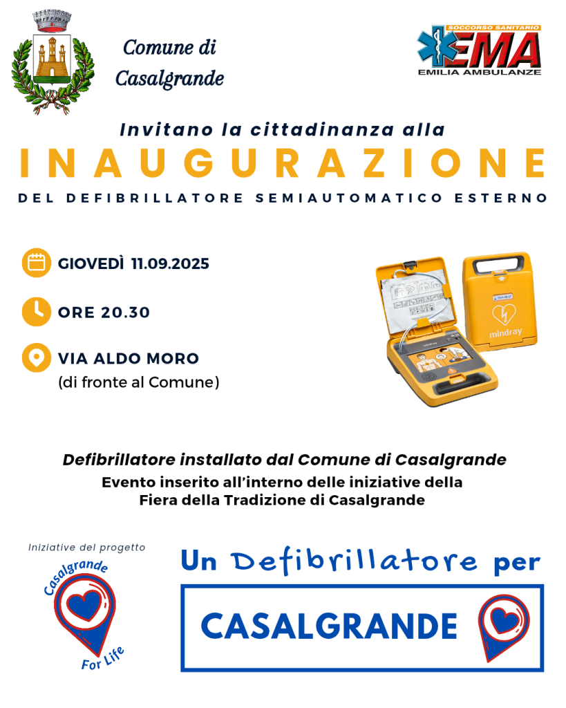 È con enorme piacere che invitiamo la Cittadinanza all’inaugurazione del 𝗗𝗲𝗳𝗶𝗯𝗿𝗶𝗹𝗹𝗮𝘁𝗼𝗿𝗲 𝗦𝗲𝗺𝗶𝗮𝘂𝘁𝗼𝗺𝗮𝘁𝗶𝗰𝗼 𝗘𝘀𝘁𝗲𝗿𝗻𝗼, installato in centro a Casalgrande, di fronte all’ingresso della casa comunale.