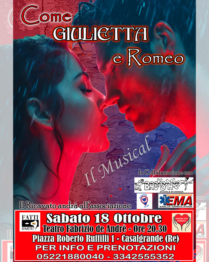 ๐ฆ๐ฎ๐ฏ๐ฎ๐๐ผ ๐ญ๐ด ๐ข๐๐๐ผ๐ฏ๐ฟ๐ฒ, alle ๐ผ๐ฟ๐ฒ ๐ฎ๐ฌ.๐ฏ๐ฌ presso il ๐ง๐ฒ๐ฎ๐๐ฟ๐ผ ๐๐ฒ ๐๐ป๐ฑ๐ฟ๐ฒ’ di Casalgrande, andrร in scena il musical “๐๐ผ๐บ๐ฒ ๐๐ถ๐๐น๐ถ๐ฒ๐๐๐ฎ ๐ฒ ๐ฅ๐ผ๐บ๐ฒ๐ผ”, a cura della compagnia “๐ญ๐๐๐๐ ๐ ’๐จ๐๐๐”, e il cui ricavato sarร devoluto a favore del progetto “๐๐ฎ๐๐ฎ๐น๐ด๐ฟ๐ฎ๐ป๐ฑ๐ฒ ๐๐ผ๐ฟ ๐๐ถ๐ณ๐ฒ” per l’acquisto di un Defibrillatore Semiautomatico Esterno.