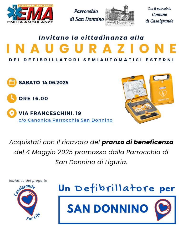 Si è svolta Sabato pomeriggio, presso la Canonica di San Donnino di Liguria, l’inaugurazione dei due Defibrillatori Semiautomatici Esterni acquistati...