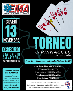 ๐๐ถ๐ผ๐๐ฒ๐ฑ๐ถ’ ๐ญ๐ฏ ๐ก๐ผ๐๐ฒ๐บ๐ฏ๐ฟ๐ฒ, alle ๐ผ๐ฟ๐ฒ ๐ฎ๐ฌ.๐ฏ๐ฌ presso l’๐ข๐ฟ๐ฎ๐๐ผ๐ฟ๐ถ๐ผ ๐ฑ๐ถ ๐ฆ๐ฎ๐น๐๐ฎ๐๐ฒ๐ฟ๐ฟ๐ฎ (via Primo Maggio 123), si terrร il ๐ง๐ผ๐ฟ๐ป๐ฒ๐ผ ๐ฑ๐ถ ๐ฃ๐ถ๐ป๐ป๐ฎ๐ฐ๐ผ๐น๐ผ ๐ฎ ๐๐ผ๐ฝ๐ฝ๐ถ๐ฒ, organizzato dalla nostra Associazione.